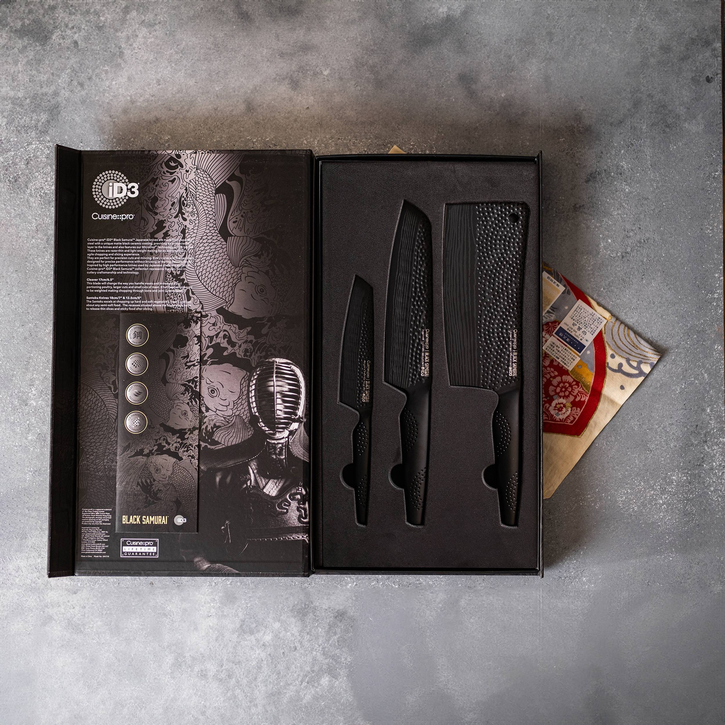 - Set Includes: 7” santoku, 6.5” cleaver and 5” santoku.