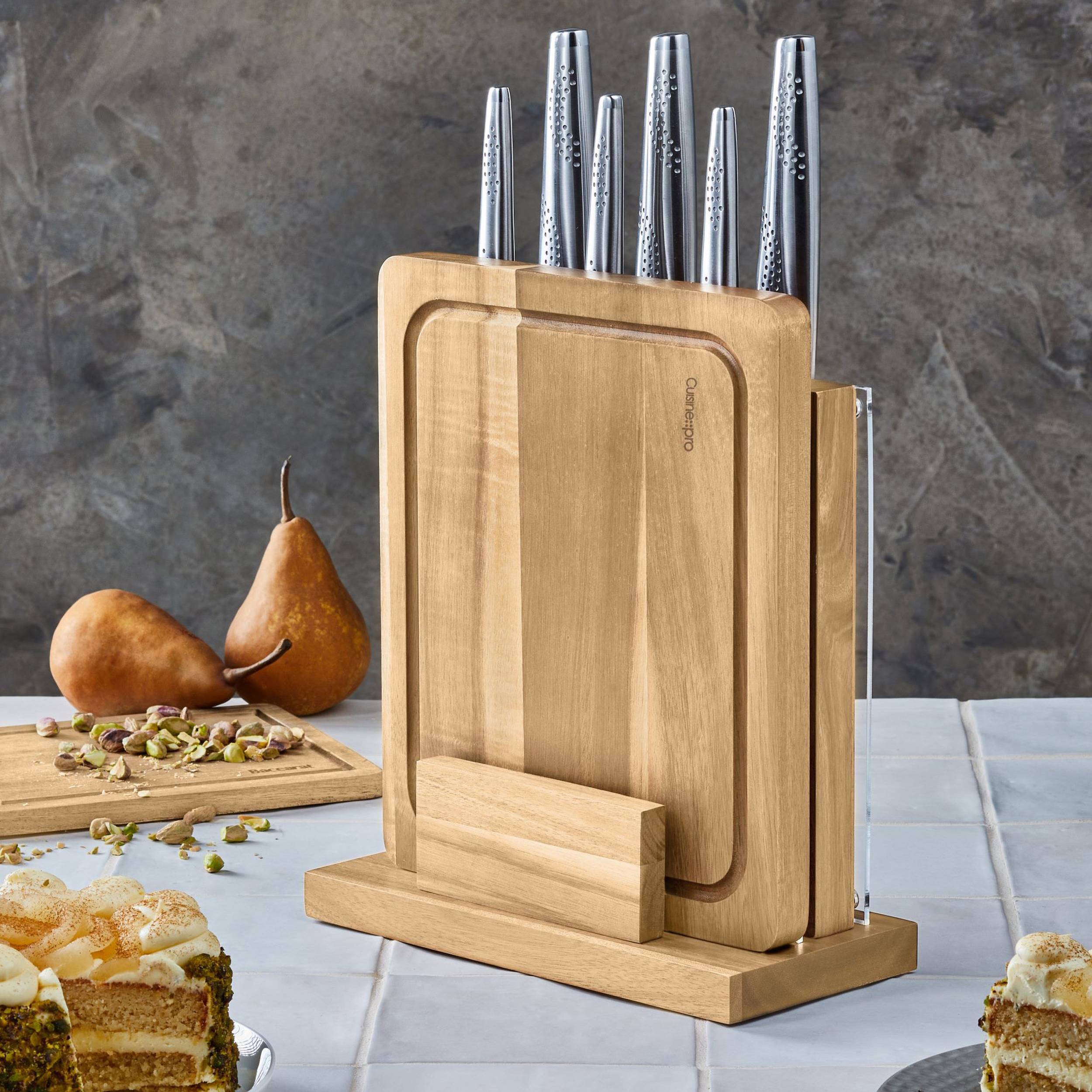 - This 7-Piece Set Includes: 3.5” Paring knife, 4” Utility knife, 5” Santoku, 6” Chef’s knife, 8” Chef’s knife, 8” Bread knife, and a magnetic acacia wood block fitted with an acacia wood cutting board.