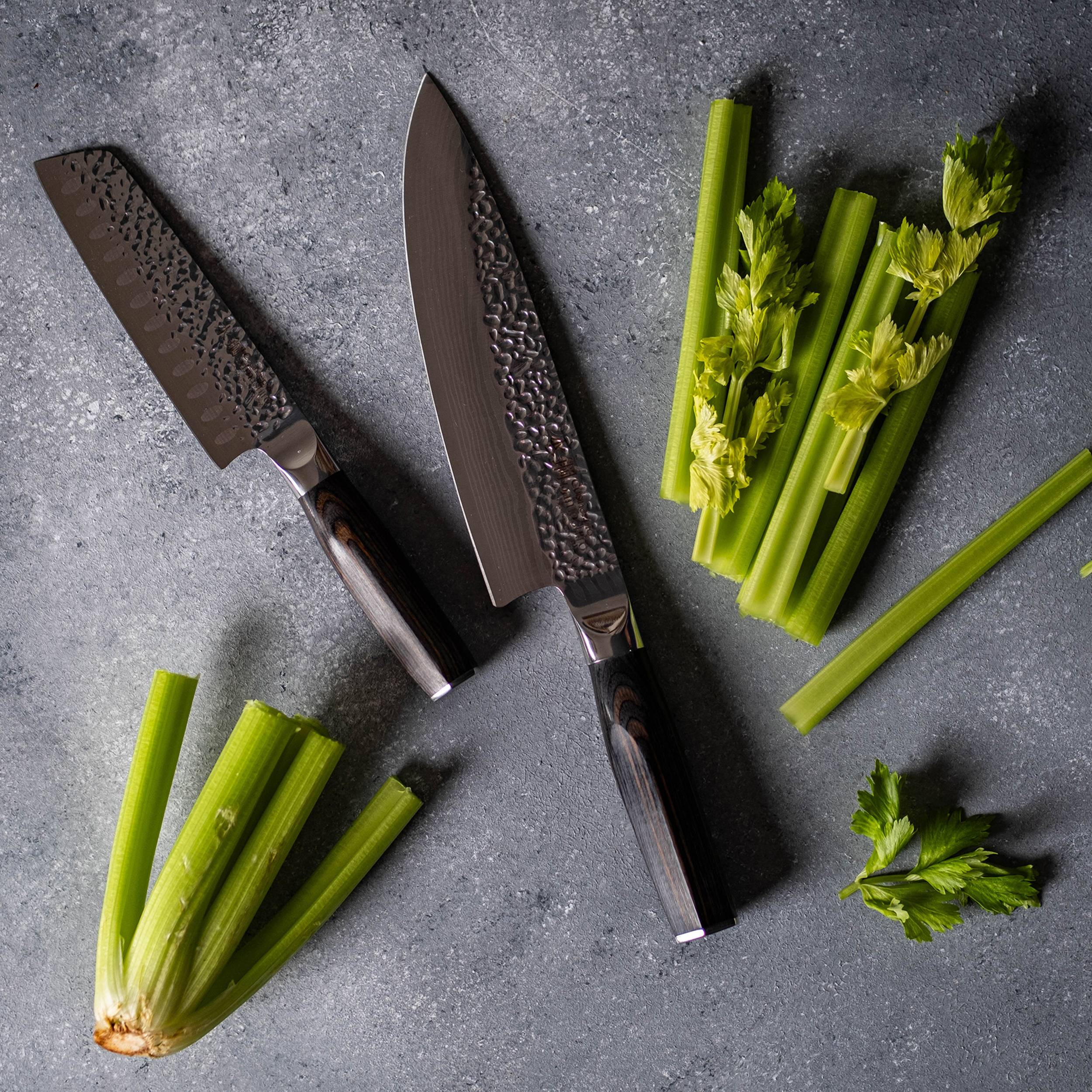 Expertly designed, the Damashiro® Emperor Santoku from Cuisine::pro® is the perfect kitchen knife for you. Experience effortless , excellent results with every use without putting too much strain on your hands. Splendidly designed and shaped for comfort and ease, the Damashiro® Emperor Santoku offers the best knife experience there is. With a traditional Japanese hammered tsuchime finish, the Damashiro® Emperor Santoku from Cuisine::pro® features a traditional inspired Damascus blade that is explicit to premium level blades. Inclusive of a traditional Japanese Pakka wood handle structure this high-quality knife is the ultimate addition to your kitchen to experience professional quality at home.