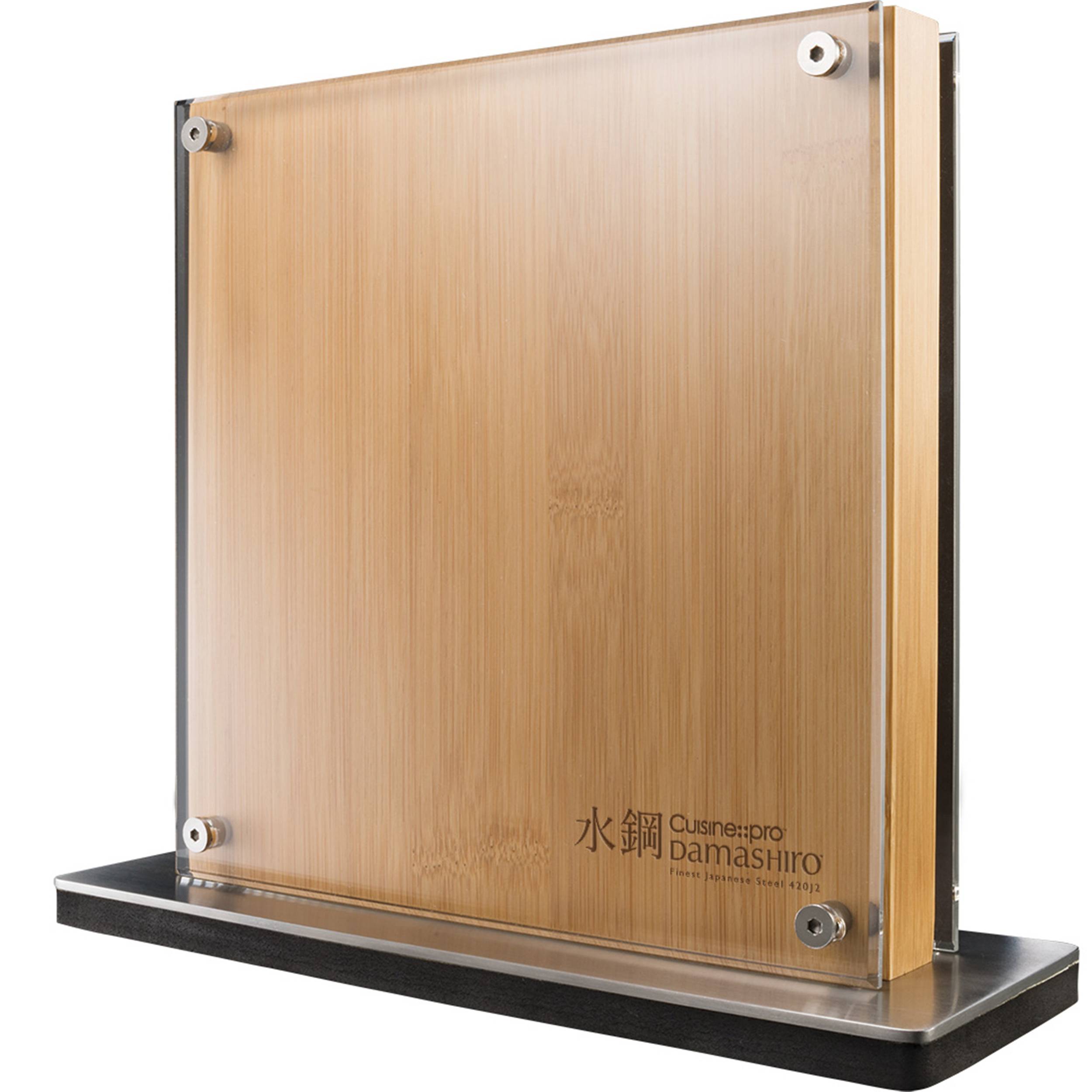 Slice and dice with ease using the Cuisine::pro® Damashiro® Emperor Shi Knife Block 7 Piece. Cuisine::pro® Damashiro® Japanese knives are made from the finest quality Japanese steel. Inspired by traditional Japanese craftsman and Samurai sword makers, these knives are characterized by distinctive traditional inspired Damascus on the blade of banding and mottling reminiscent of flowing water. Damashiro® blades are made from specialist ice hardened Japanese steel which makes them super tough, resistant to shattering and capable of being hones to a sharp resilient edge. The Cuisine::pro® Damashiro® Emperor Shi Knife Block 7 Piece features 6 essential blades that are housed in a stunning bamboo block, with a protected view of the impressive blades.
