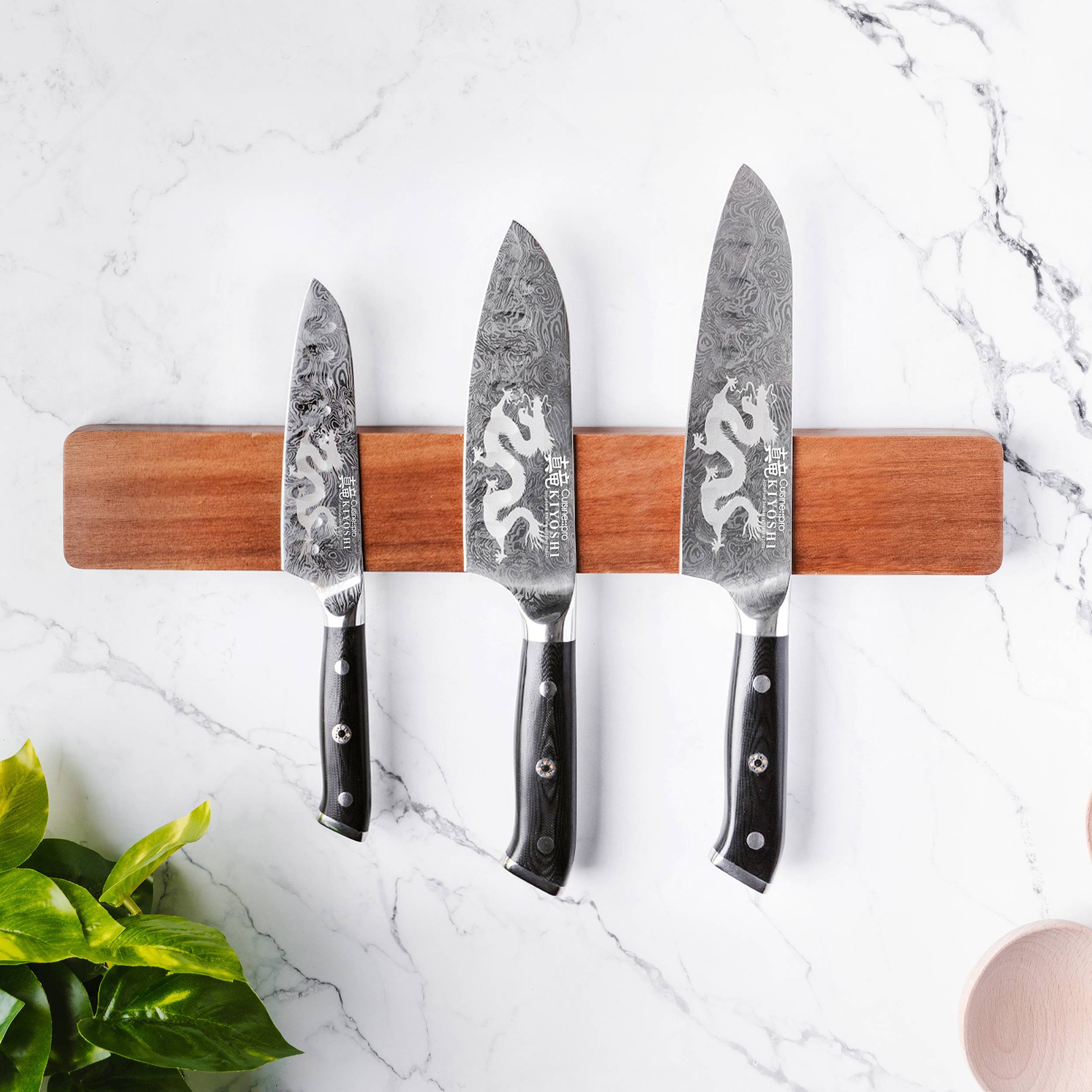 Featuring a distinctive trademark dragon on the blade and inspired by traditional Damascus, the KIYOSHI™ knives by Cuisine::pro®feature triple-riveted handles with an exquisite mosaic motif.