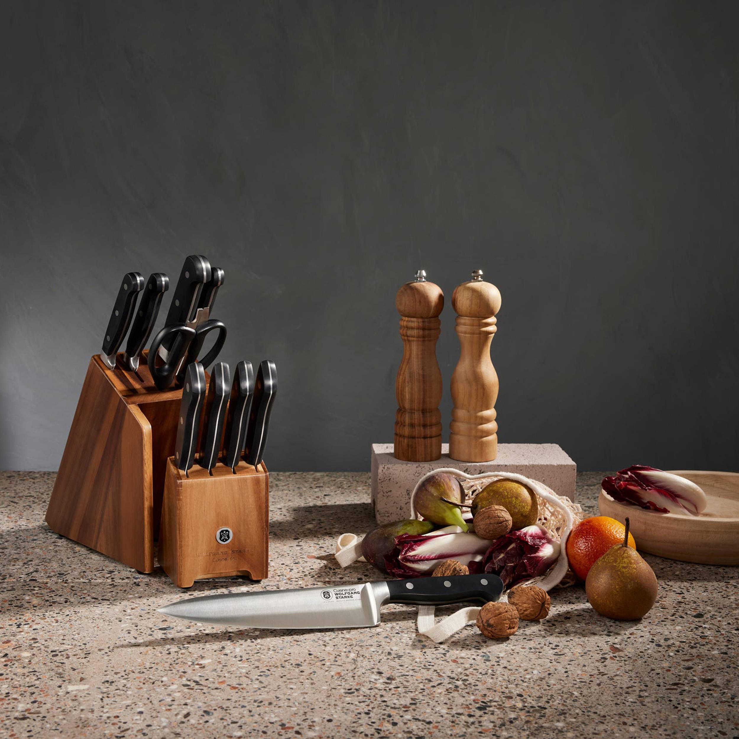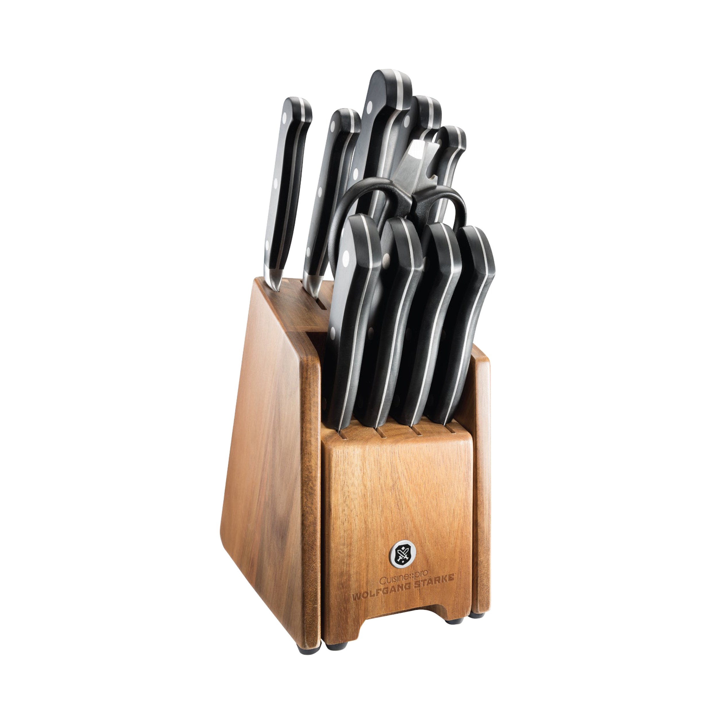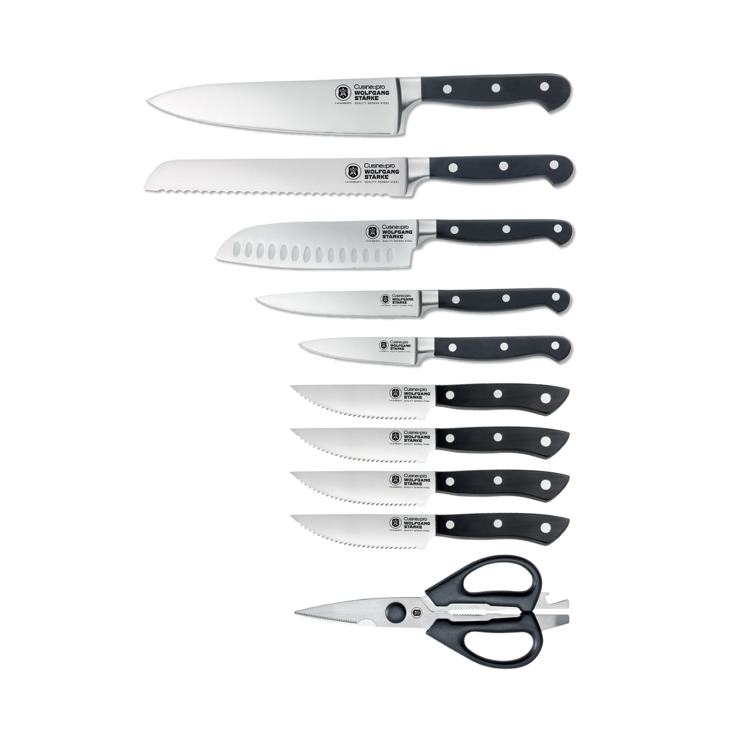 - The Cuisine::pro® Wolfgang Starke™ Kutchin 11 Piece German Steel Knife Block contains 4 x Steak Knives, 1 x 9cm/3.5" Paring Knife, 1 x 12cm/5" Utility Knife, 1 x 14cm/5.5" Santoku Knife, 1 x 20cm/8" Bread Knife, 1 x 20cm/8" Chef's Knife, 1 x Kitchen Shears. Housed in a stylish knife block to showcase your blades.