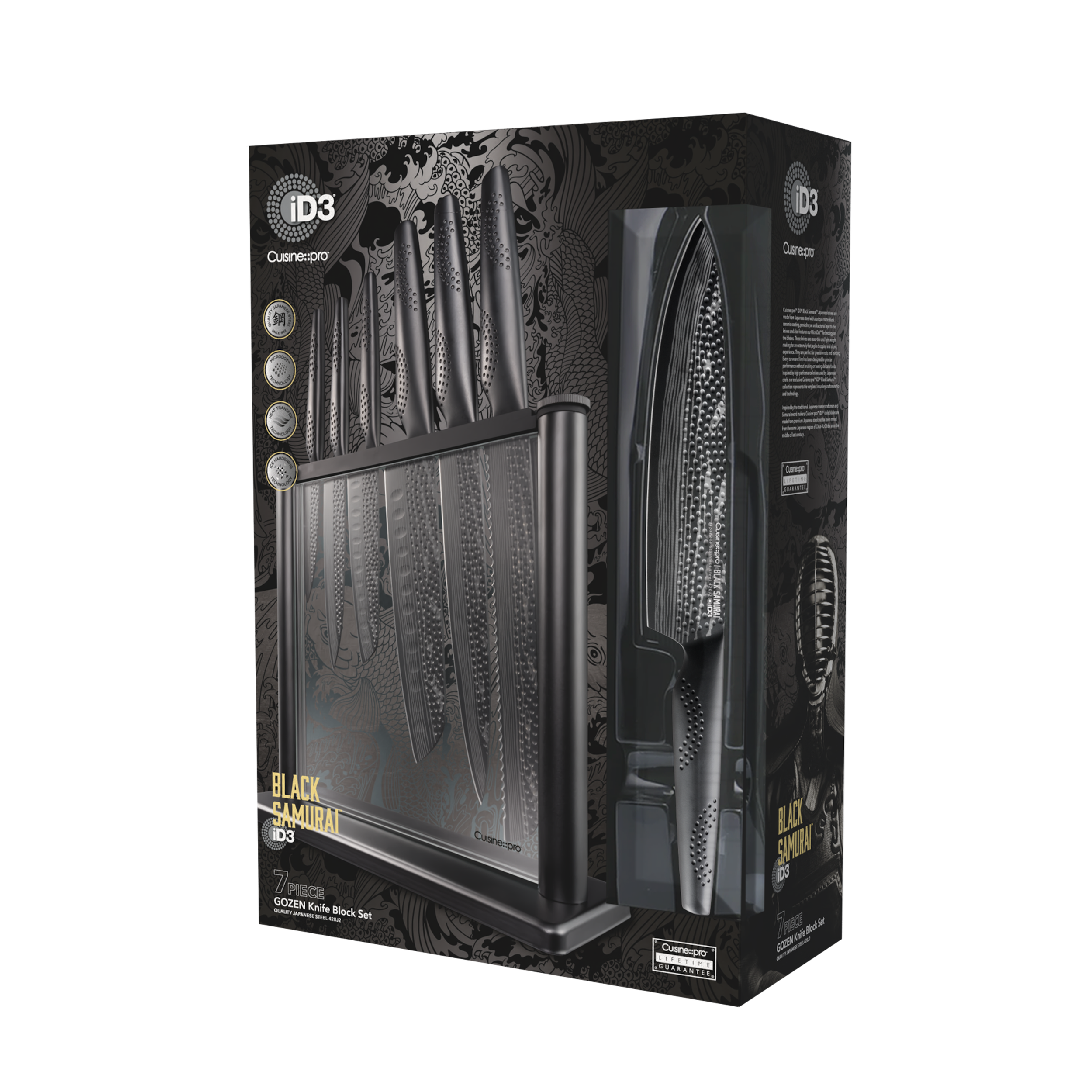 - The Cuisine::pro® iD3® Black Samurai™ Gozen Knife Block 7 Piece contains 1 x 20cm/8" Carving Knife, 1 x 20cm/8" Bread Knife, 1 x 18cm/7" Santoku Knife, 1 x 13cm/5" Chefs Knife, 1 x 12.5cm/5" Santoku Knife, 1 x 9cm/3.5" Paring Knife. Housed in a stylish knife block to showcase your blades.