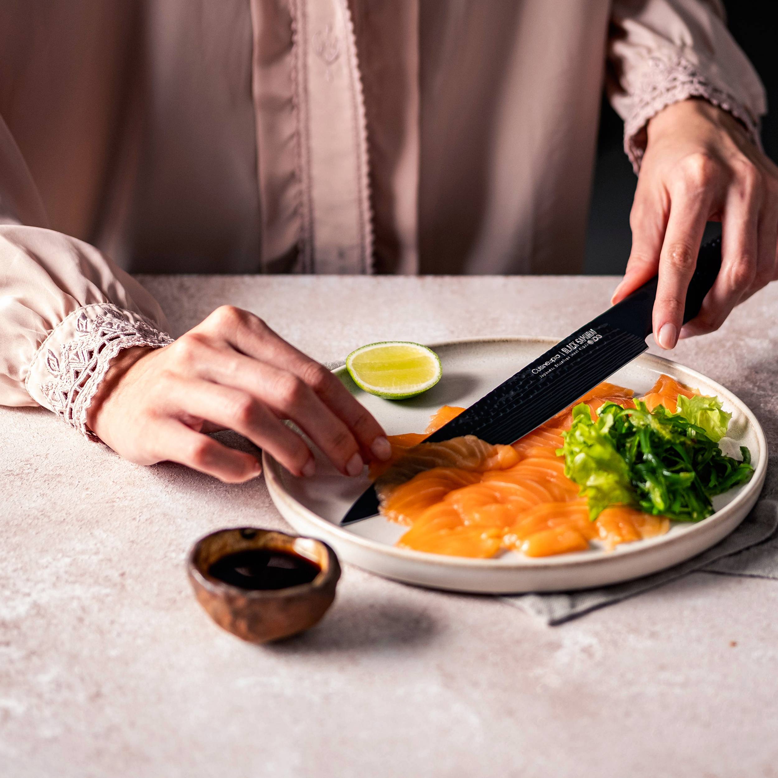 Cuisine::pro® iD3® Black Samurai™ Japanese knives are made from Japanese steel with a unique matte black ceramic coating, providing an antibacterial layer to the knives and also features our microdot technology on the blades.