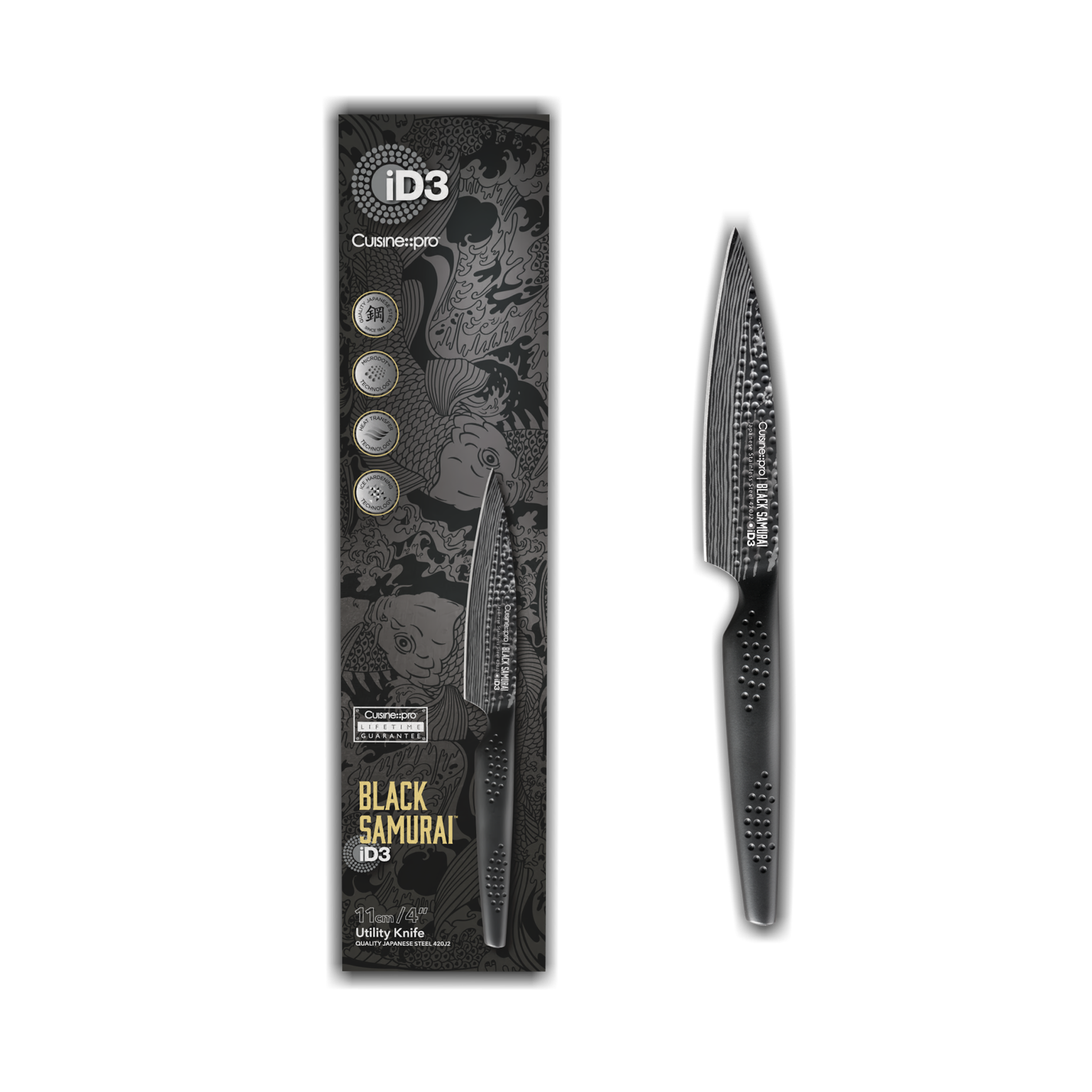 - The Cuisine::pro® iD3® Black Samurai™ Utility Knife 11cm/4" is a medium sized all-purpose knife that is ideal for a wide variety of common kitchen functions such as cutting cheese, chopping fruit and vegetables and slicing fish.