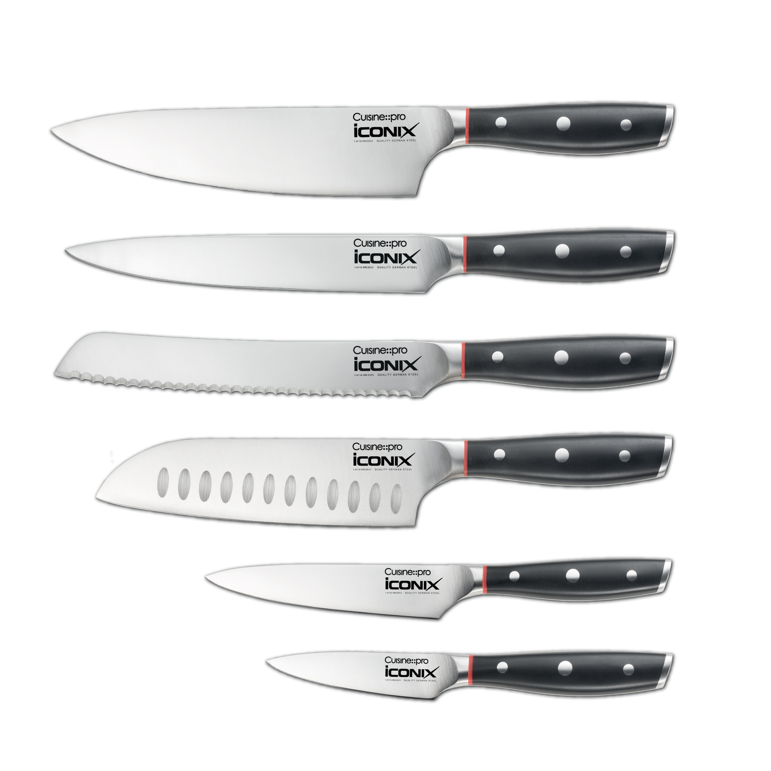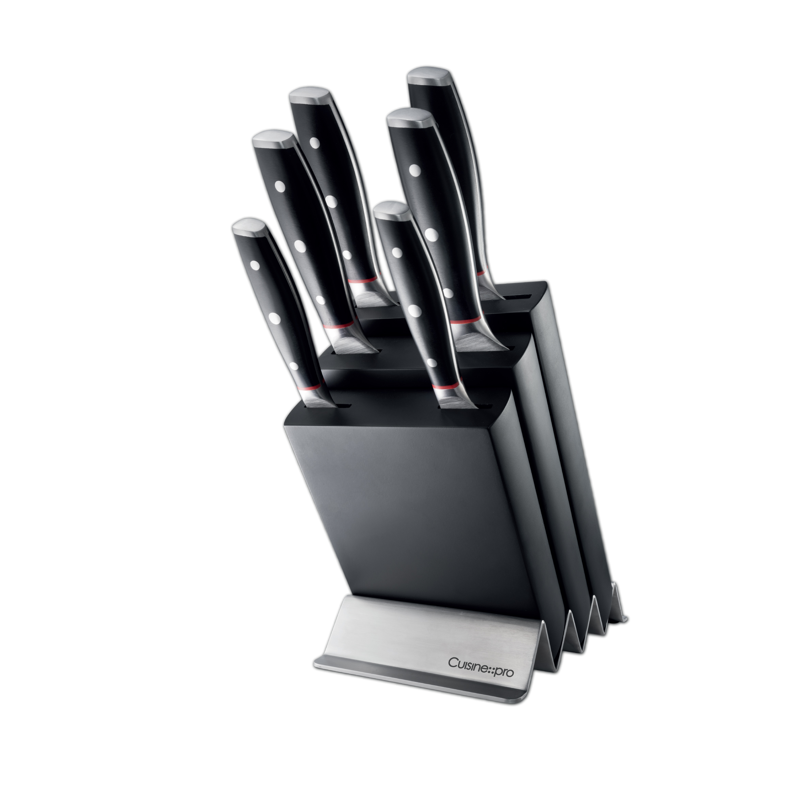 - This 7-piece set Includes: 8" chef’s knife, 8” bread knife, 8" carving knife, 7" santoku, 5" utility knife, 3.5" paring knife and a sleek, black rubber-coated wood knife block.