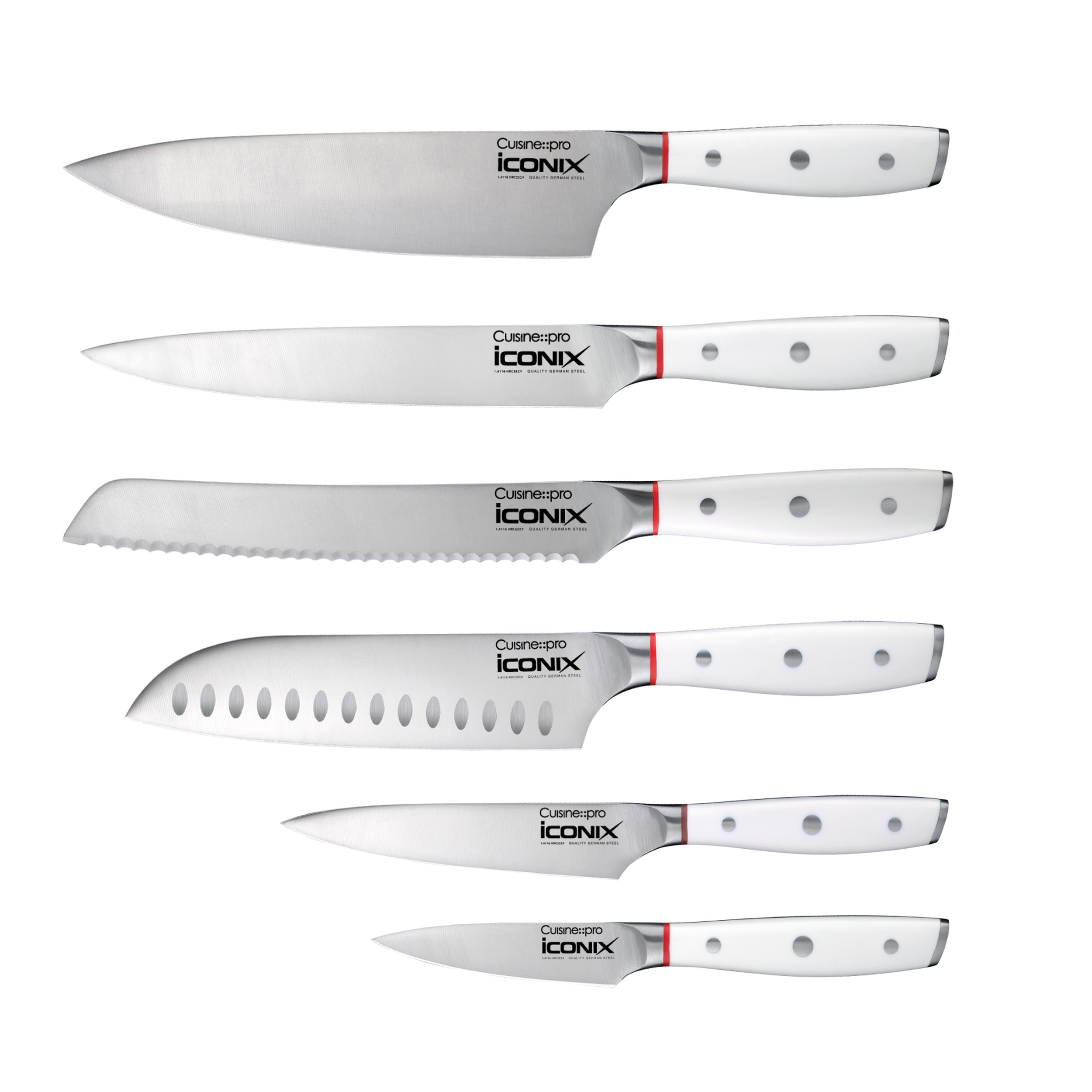 - This 7-piece set Includes: 8" chef’s knife, 8” bread knife, 8" carving knife, 7" santoku, 5" utility knife, 3.5" paring knife and a sleek, white rubber-coated wood knife block.