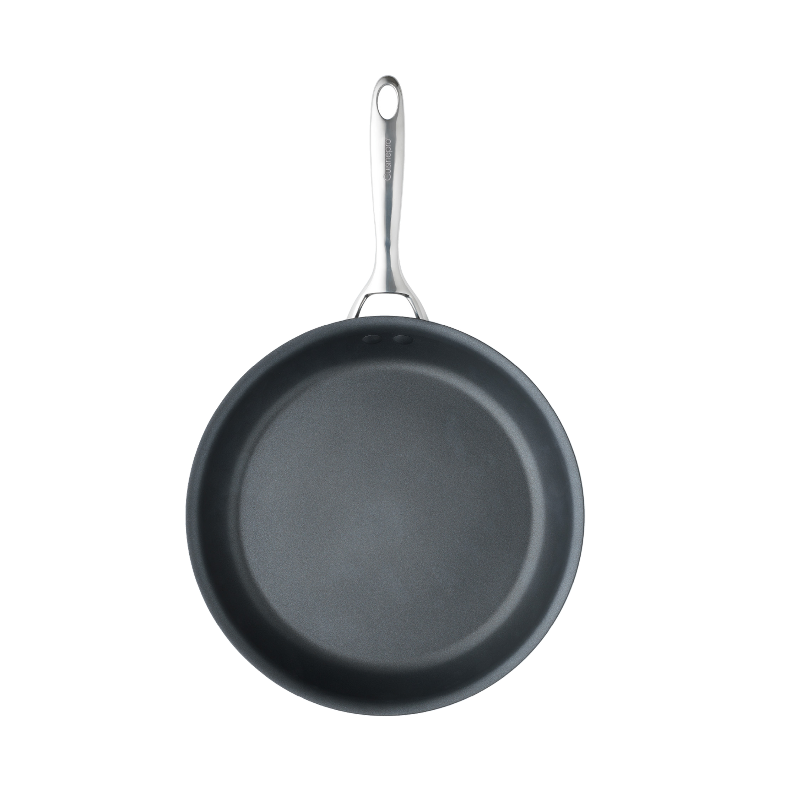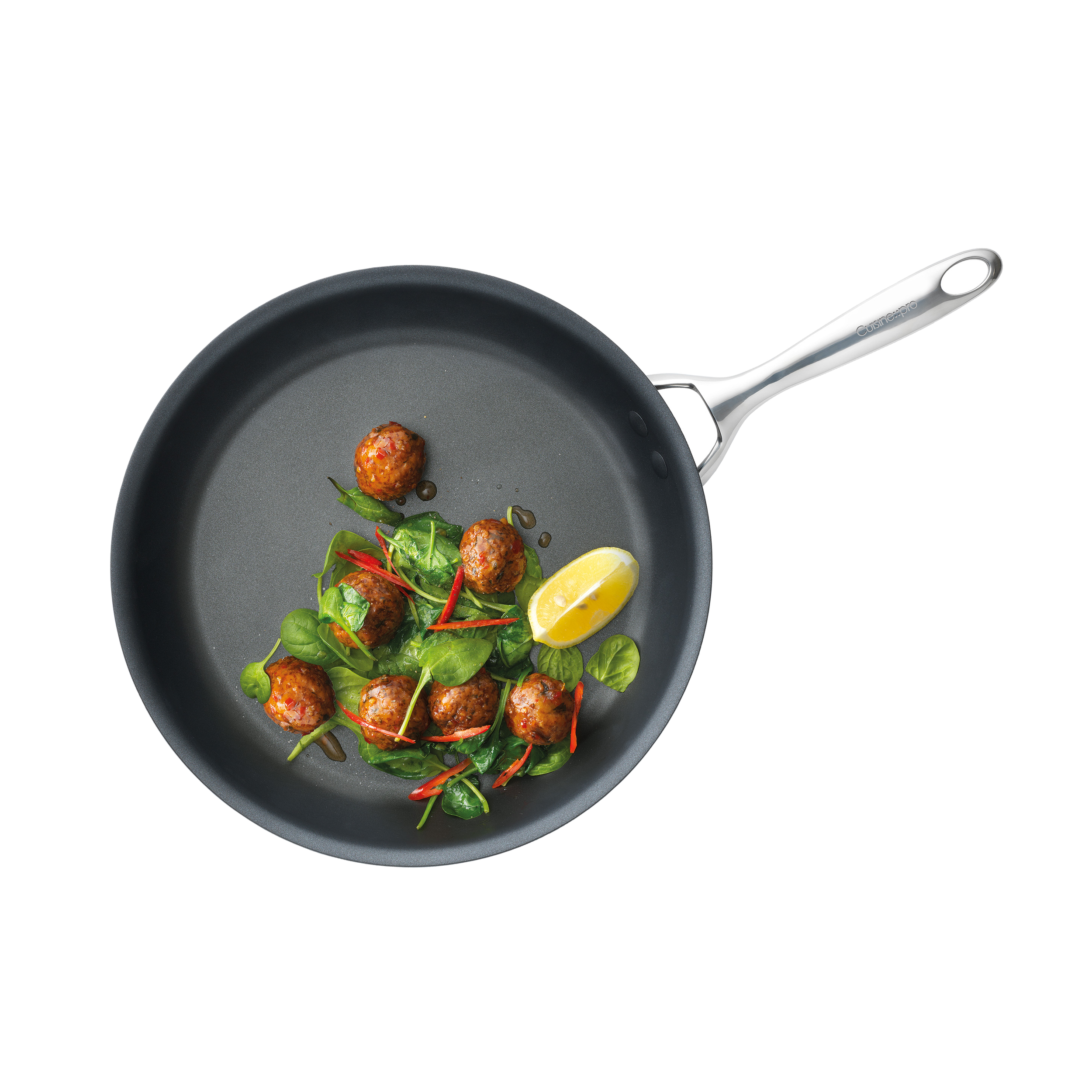 Get cooking with the Cuisine::pro® iD3® Hard Anodised Frypan 30cm. The pan has been hard anodised to create a super tough warp free surface and body, resulting in a pan that is twice as hard as stainless steel. The pan promotes rapid heat transfer and efficient heat distribution for even cooking, eliminating hot spots and burning in the pans interior corners. The interior and exterior features a tough TRI-TEC triple layer non-stick, providing quick easy cooking, long lasting food release and faster clean up. The TRI-TEC triple layer is perfect for low fat cooking as you can use less oil. The Cuisine::pro® iD3® Hard Anodised Frypan includes a magnetic stainless steel induction plate making the iD3® suitable for all cooktops. The pan offers the convenience of quick and easy clean up that literally rinses and wipes clean but is also dishwasher safe.